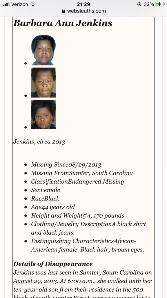 I’m not seeing similarities but the UID photo isn’t particularly clear. No glasses are reported for the missing. Not a lot of identifiers for the UID. Her name is Barbara and she went missing off I 20 about an hour away and what looks like a straight shot to Augusta. She had a medical condition and did not have her meds.