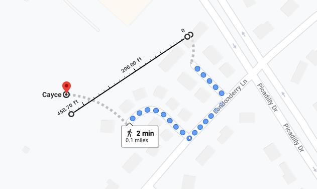 On the Google map, if you measure straight from CT's apt at 602 Picadilly Square through the woods to the NAPA building, it is about 154 ft. If you measure the woods from Picadilly Drive, the road coming into the neighborhood, to the opposite end, that is about 500 ft. Also, Faye's address was 16 Londonderry Square. I am not insisting I am right, but respectfully disagreeing. I think Faye was not a football field away, but near to CT's back door.