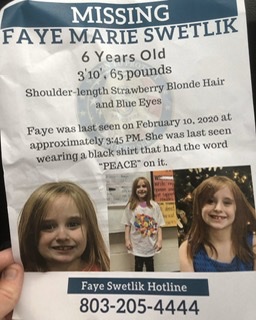 Happening now. Every vehicle that pulls in or out of this Cayce neighborhood is being stopped. I saw Deputies showing a picture of Faye Swetlik, taking down driver info and tag numbers. The six year old girl has been missing for about 24 hours now.