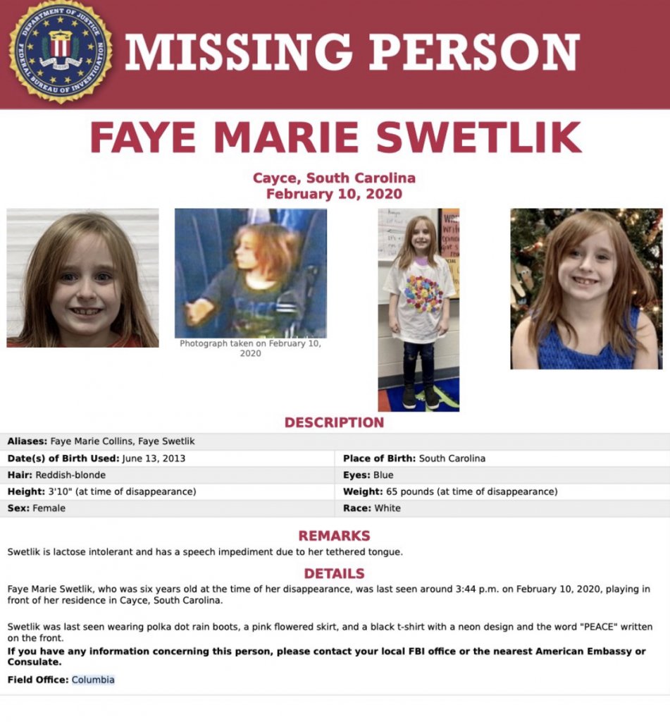 Police are now searching outside the one mile radius of the Churchill Heights neighborhood where Faye Marie Swetlik was last seen, Sgt. Evan Antley said at a Wednesday news conference at Trinity Baptist Church in Cayce. Police are searching along Interstate 26 moving east toward Charleston Highway and other areas outside of Churchill Heights.