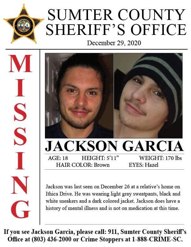 Sumter County Sheriff’s Office is asking for the public’s help in locating 18-year-old Jackson Brent Garcia who was last seen on Ithica Drive on December 26.