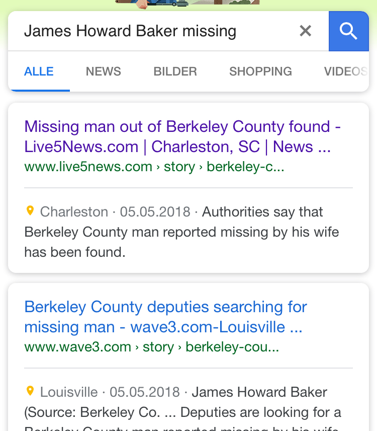 Mr. Baker was last seen on April 19, 2018 and is believed to be driving a Ford F-150, grey in color baring SC License Plate of PBL612.