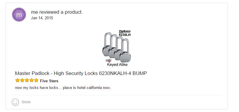 Just discovered TK's Amazon page and was reading through his reviews. While they are almost all super creepy, one stood out. A review for uncuttable locks with a Hotel Ca reference in his review. Wasn't there a Hotel Ca reference made by whoever hacked CDC's FB page?
