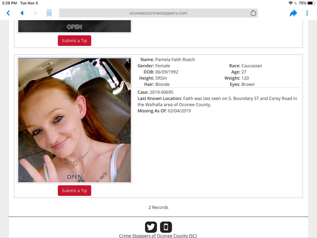 snip <The Oconee County Sheriff’s Office is asking anyone with any information on the Missing of Pamela (Faith)Roach please contact Crimestoppers at 1-888-CRIME-SC to report any information. You can also contact Crimestoppers by leaving an internet tip by going to www.p3tips.com and clicking on Submit a New Tip or by downloading the P3 Tips app on your Apple or Android devices.