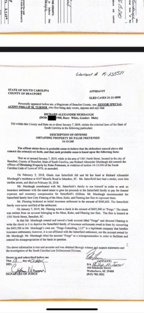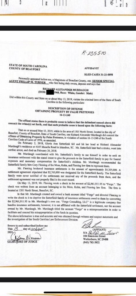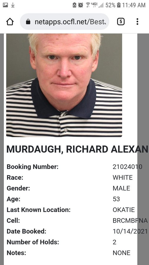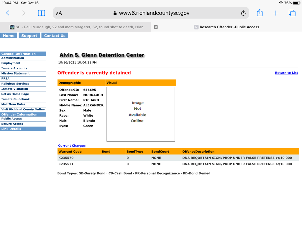 Inmate records from the Alvin S. Glenn Detention Center in Columbia list Murdaugh in custody based on allegations of obtaining property under false pretenses. Two counts are listed with bond of $10,000 each.