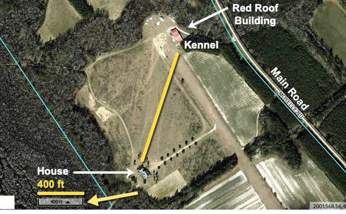 Distance from house to kennel looks like 1000 feet, or 350 yards.