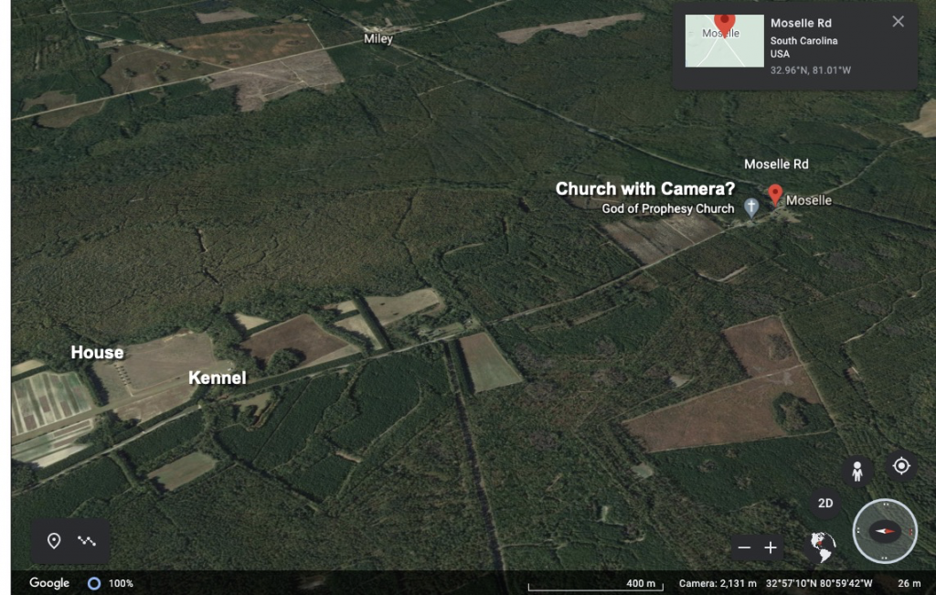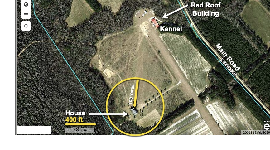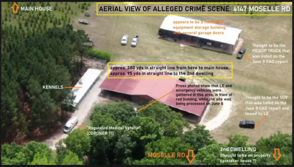 ADDED: My thought has been that the bodies were found either on that gravel in front of the sheltered kennels or maybe just to the right in the grass just pass the cages. I'm basing that on where the coroner's van is parked and where LE/SLED had gathered during the site investigation. Just from a convenience stand point, I don't think LE would have been concentrated around that red-roof bldg if the bodies had been found out in the field or up the driveway heading toward the main house.