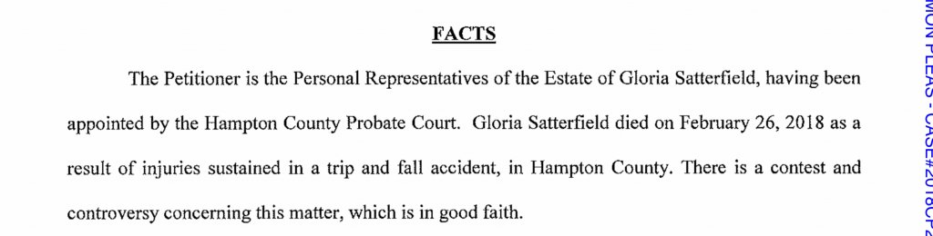The lawsuit said the fall happened in Hampton County and the Hampton coroner is investigating.