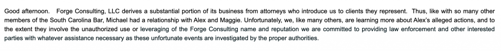 Update : Forge Consulting LLC has issued the following statement that says they did not know about Alex Murdaugh’s alleged scheme and they’ve contacted police.