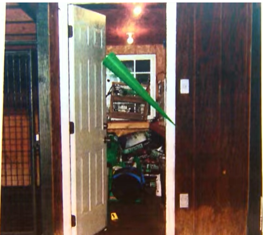 Shown the photos of the dogs and kennels from the night of the murders. He says water shown pooled in front of the kennels by the feed rooms is NOT how it normally pooled. Also, he notes Bubba is in the first kennel by the feed room, not Grady the way he left them. He says Maggie liked Grady being in the first kennel video.