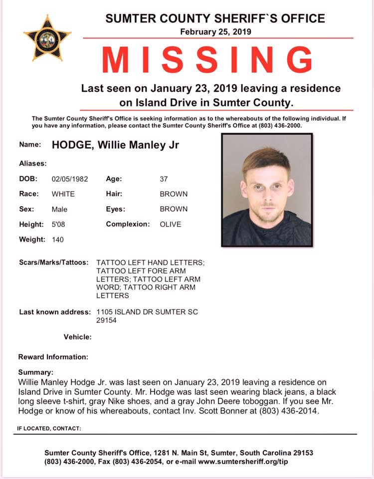 Hodge was last seen by his family in Sumter County, South Carolina on the evening of January 23, 2019. He had an altercation with his mother, left a residence in the 1100 block of Island Drive, and never returned.