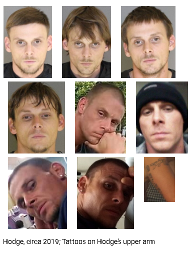 • Distinguishing Characteristics: Caucasian male. Brown hair, brown eyes. Hodge's nickname is JR. He has the following tattoos: letters on his left hand, letters on his left forearm, a word on his left arm and letters on his right arm. A photo of some of his tattoos is posted with this case summary.