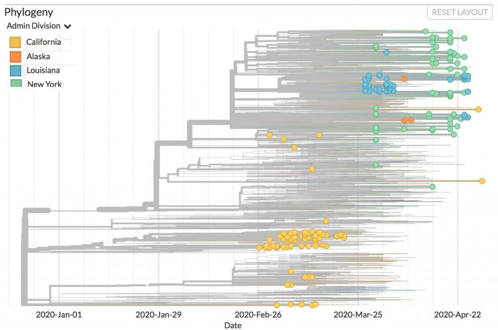 233 new sequences added to Nextstrain from US. Notice how the CA strains cluster separately from the NY and New Orleans.