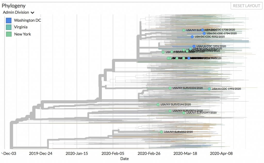 43 additional sequences for NY, Virginia, and DC analyzed by Nextstrain. Notice how they cluster at the top of the tree like the earlier one I shared several posts back.