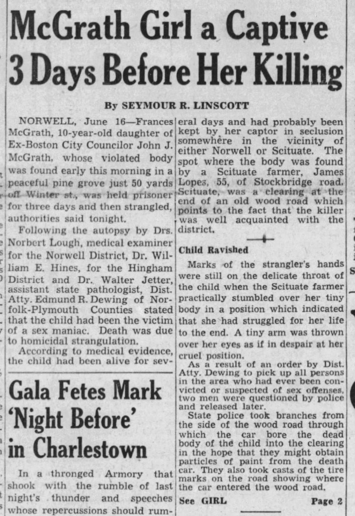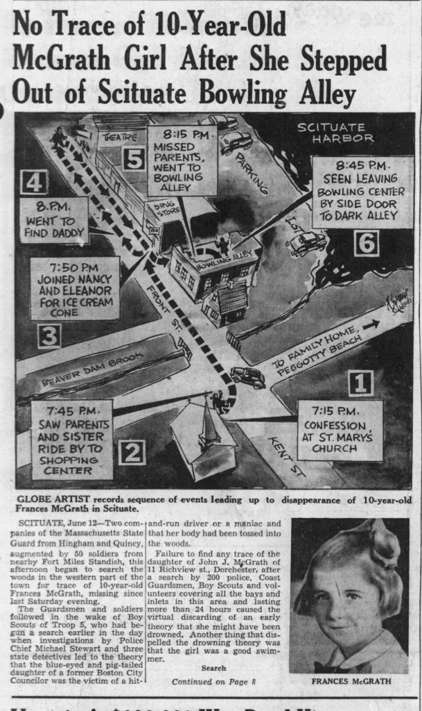 Frances McGraph, 10, of Dorchester, daughter of former Boston City councilor John H McGraph, was last seen on Saturday June 10th 1944 as she left a Scituate, Massachusetts bowling alley through a side exit.