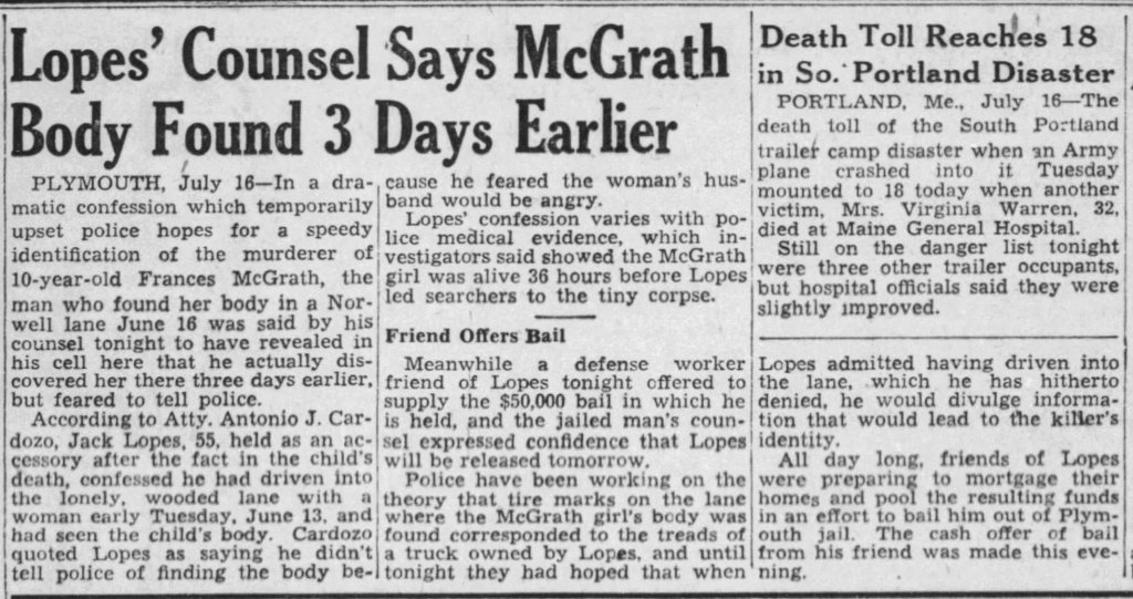 Lopes and Pina were acquitted and not held responsible for the death of Frances.The McGraphs had only just moved into their summer cottage that day, but had lived there the last three summers. Leads were followed over the years however not a single one proved to be concrete. After 1952 I could find no mention of this case.