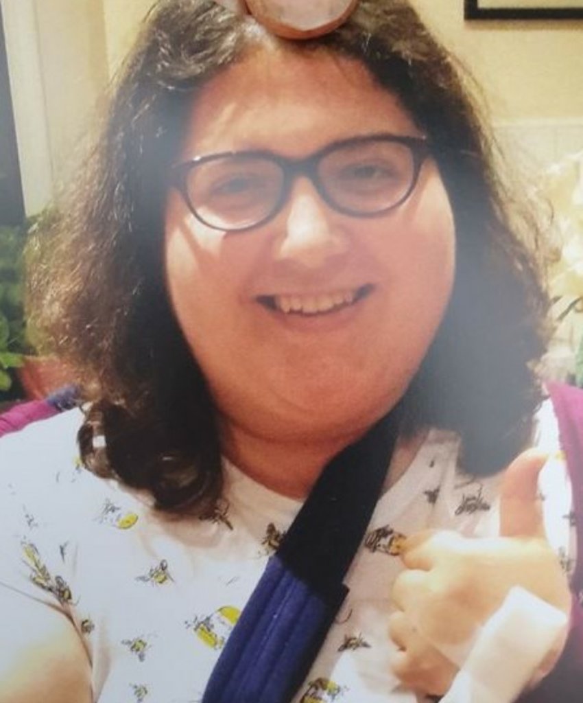 When last seen, she was wearing a khaki top with a white t-shirt underneath which was decorated with lemons and black dots.