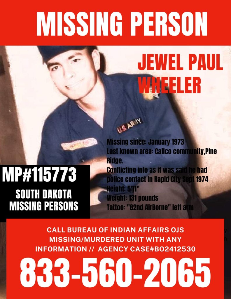 Jewel Wheeler was last seen on the Pine Ridge Indian Reservation near the Calico Community. No other information is available at this time.