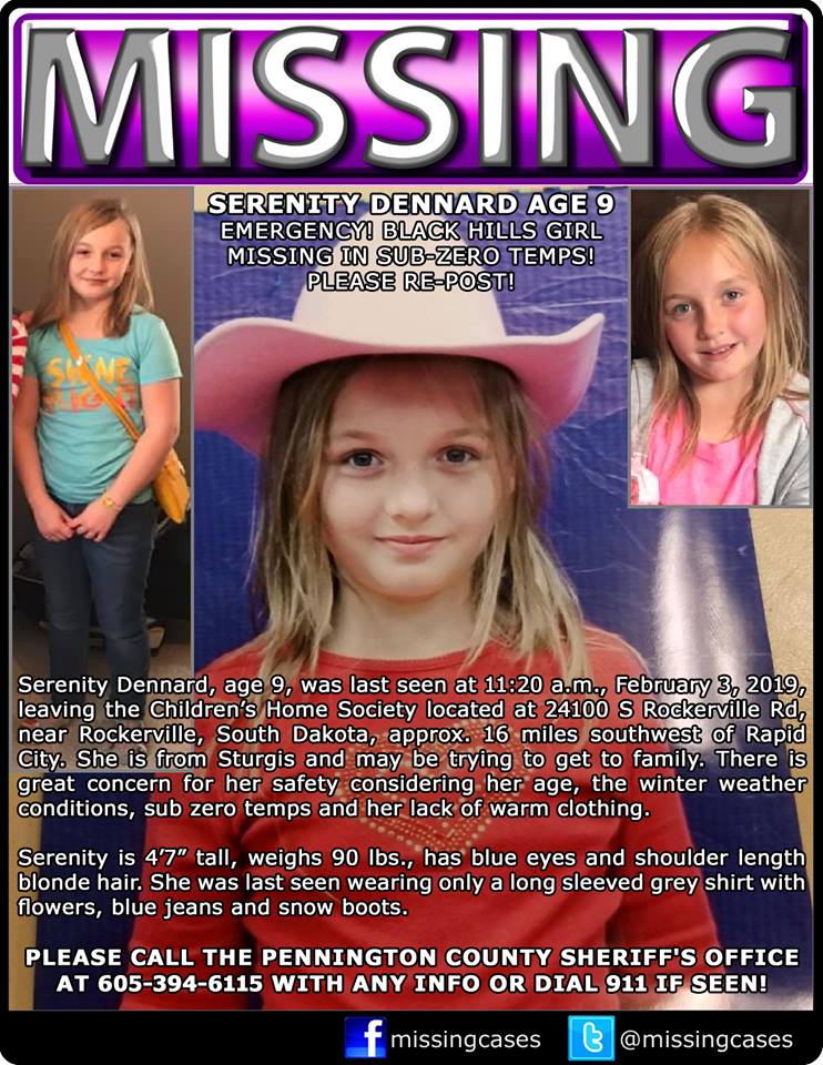 Pennington County, SD – The Pennington County Sheriff’s Office has made the decision to transition the search for missing nine year old Serenity Dennard from a rescue to a recovery operation. If Serenity was outside, it’s unlikely she survived. We have not ruled out the possibility that she found some place warm to shelter or that someone picked her up. We still have an active investigation and will follow up on all leads.
