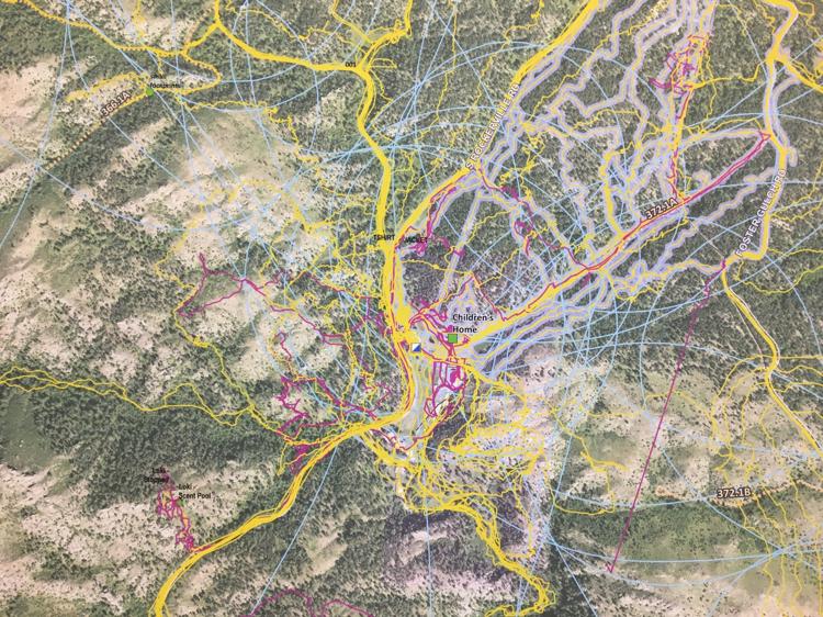 "A close-up image of where search and rescue personal have searched for 9-year-old Serenity Dennard. The yellow lines represent people, the hot pink lines represent dogs, and the blue lines represent an airplane."