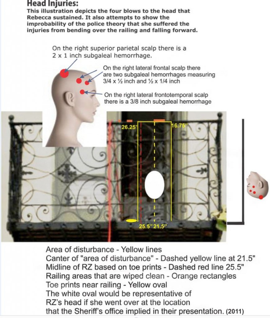 Continuing on, the ME doesn’t explain how, according to his theory of Rebecca going “face-first over the railing,” she could have done so without sustaining significant trauma to the front of her face from contact with the railing.