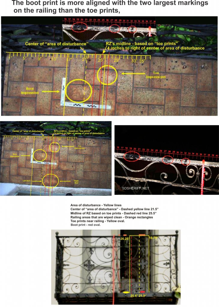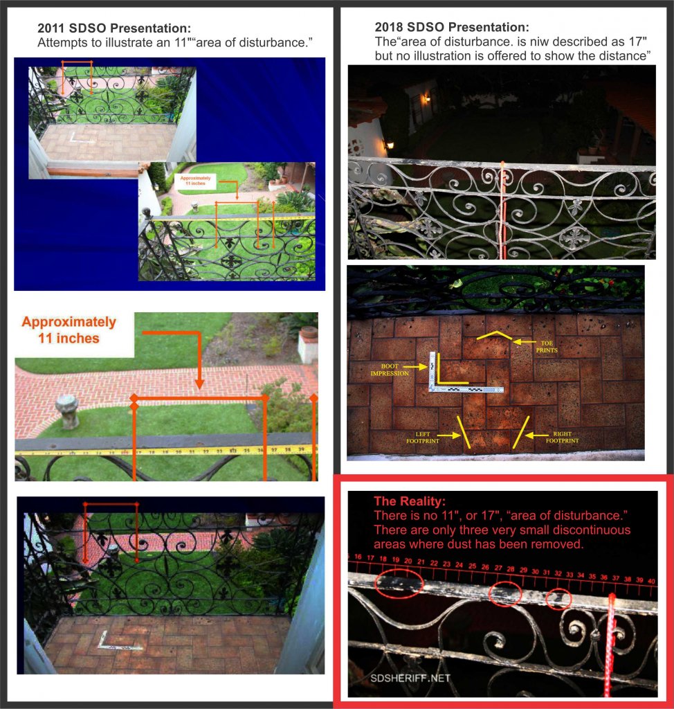 Williams makes mention of a seventeen inch, “area of disturbance,” on the balcony rail. There is no 17” area of disturbance in the dust on top of the balcony railing and it should be noted that in the 2012 press conference by the SDSO, the so called “area of disturbance” was described as 11 inches.