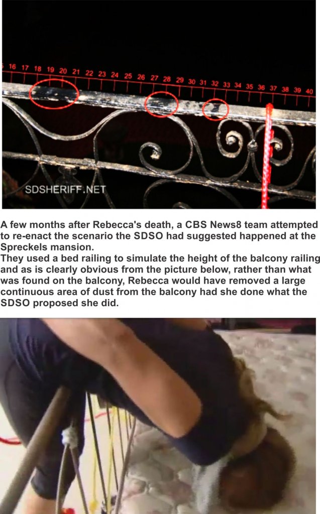 “Rebecca went face first over the railing and impacted – slid down the wall – breaking the foliage as well as leaving marks on the wall before the full length of the rope was reached, and in fact did hang herself.”