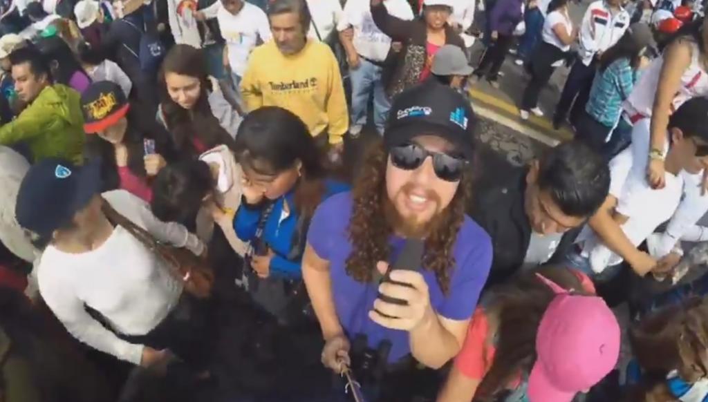 Musician Diego Mino excitedly ran through crowds gathered for the Pope's visit to Quito, Ecuador, Tuesday, excitedly filming himself with a selfie stick.