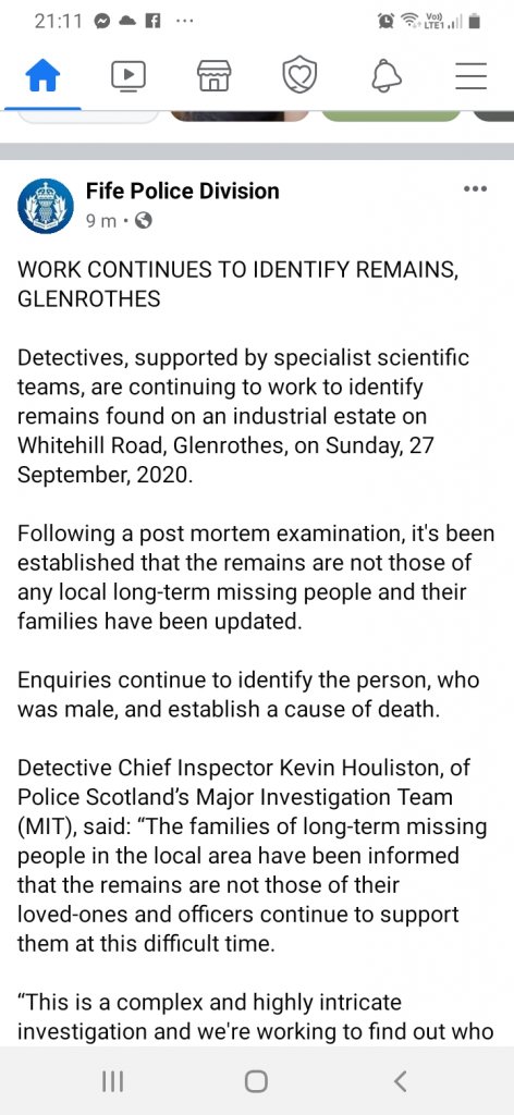 Remains found Glenrothes. Male. Not allan bryant or kenneth jones.