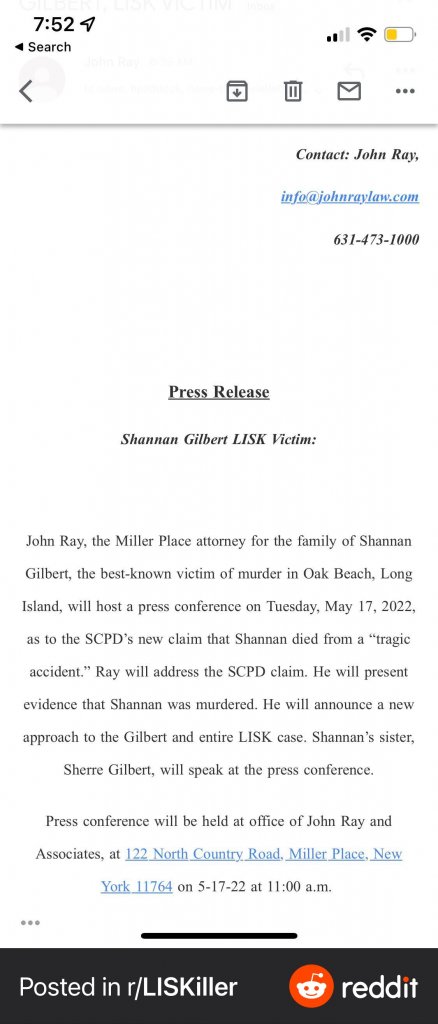 John Ray, the attorney for Shannan Gilbert’s family will hold a news conference at his office on Long Island around 11:30 a.m. He said he will present evidence concluding that she was the victim of a homicide.