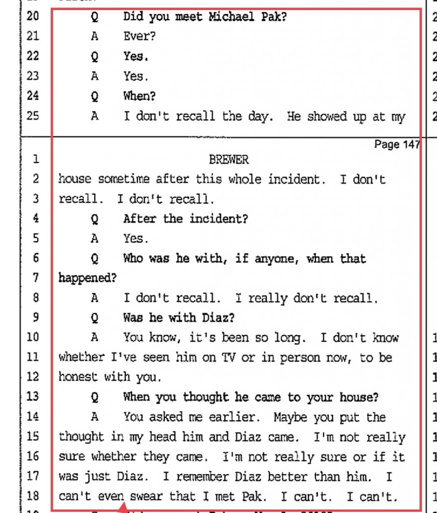 We do not know anything that was said in those phone calls, where Brewer, Shannan or Pak were while the calls were made or what they were doing.