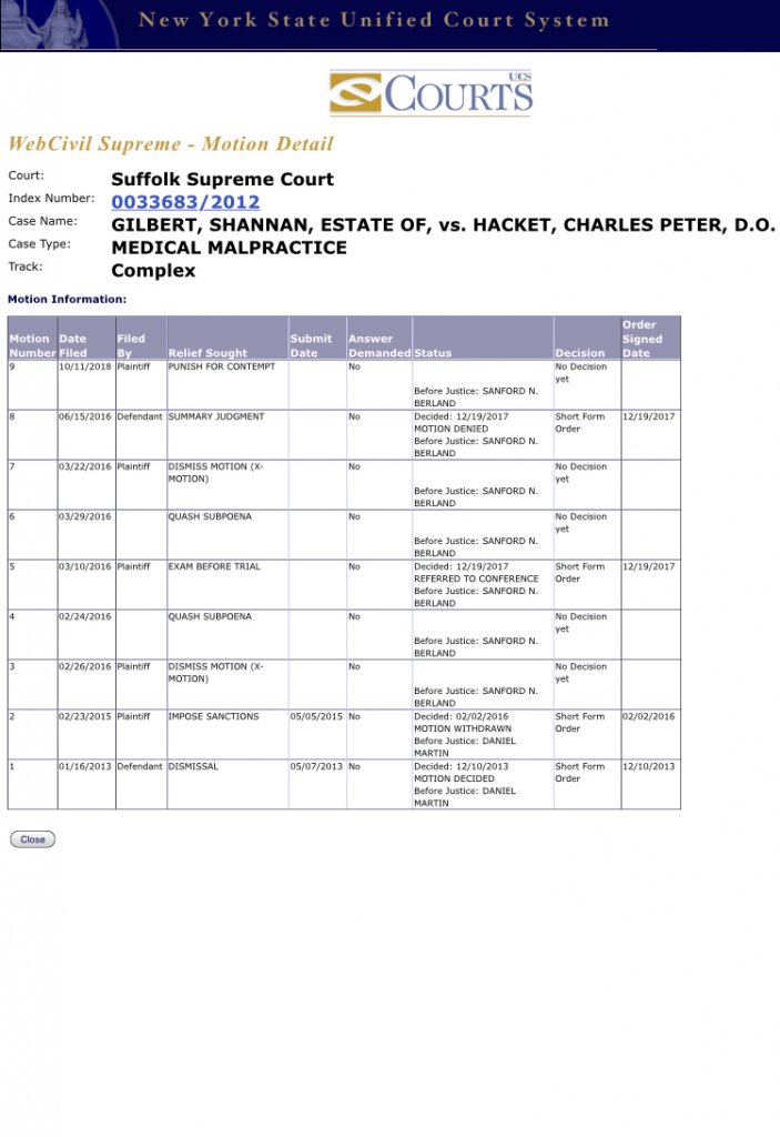 The latest hearing regarding the motion to release Shannan Gilbert’s 23 minute 911 call, in the case of Estate of Shannon Gilbert vs. Charles Peter Hackett, was held on October 16, 2018. It has not been rescheduled. Please note on attached photo the word “Notified” in the remarks. I will update this thread as new information becomes available.