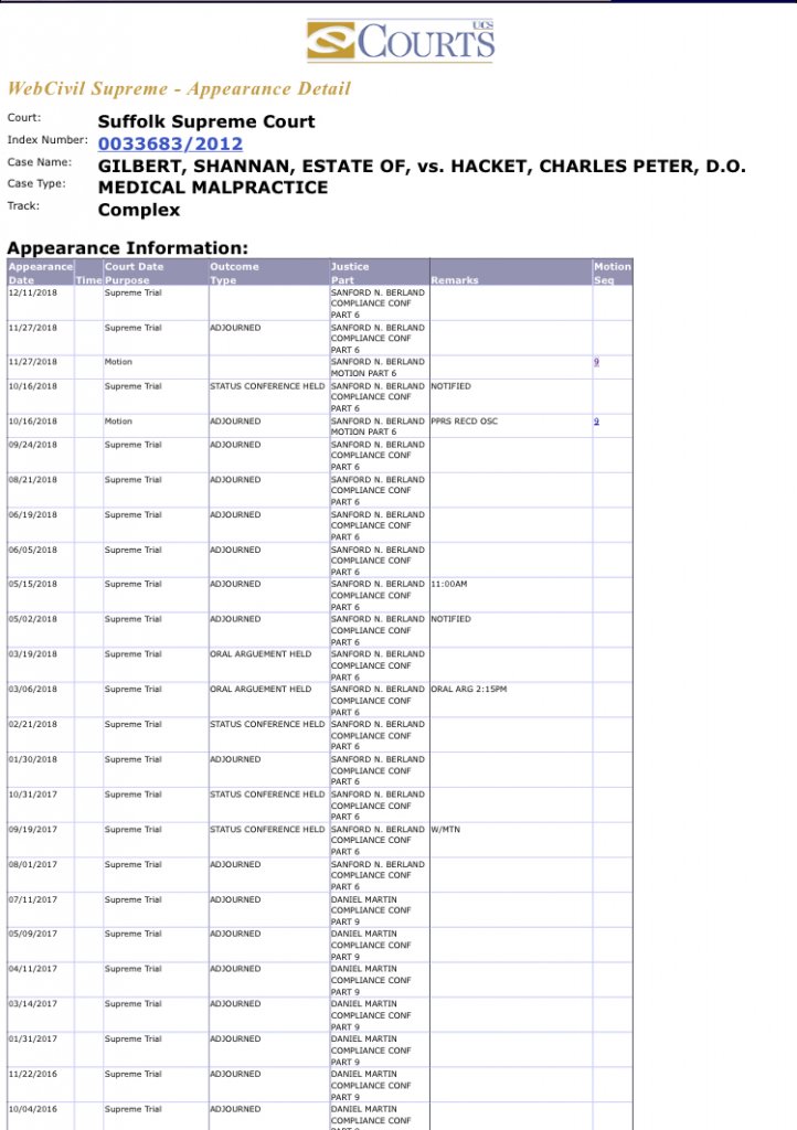 The latest hearing regarding the motion to release Shannan Gilbert’s 23 minute 911 call, in the case of Estate of Shannon Gilbert vs. Charles Peter Hackett, was held on November 27, 2018. It has been rescheduled for December 11, 2018.