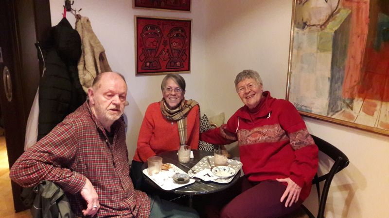Thanks! I surely did have a good visit with my sister! Here we are - with her husband at the Zoegas Cafe est. in 1901 - in Helsingborg. I'm in the middle! :)