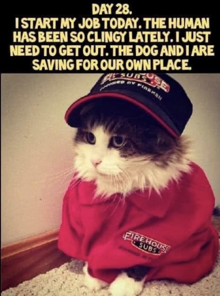 My husband and I are on Day 40 of going no where, being home all of the time.
