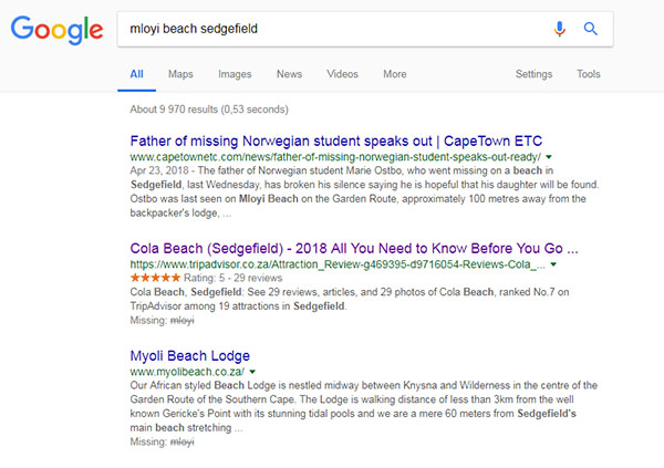[FONT="]"Marie arrived in Sedgefield, as part of a tour, at 17.30 on Wednesday 18 April. The group was due to stay at Afrovibe Back Packers near Myoli Beach. At approximately 18.10 a couple who were part of the tour, went for a walk on the beach, followed five minutes later, by Marie, who was walking alone.[/FONT]