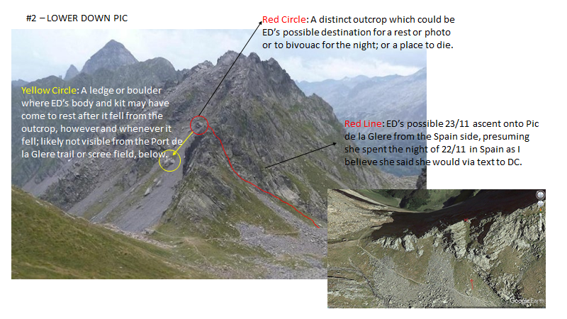 OK, @Federico_A, I have gone back to Thread #6 for the X you marked on the image of Pic dl Glere from the Spain side. And I remapped my drawing (from earlier today) on the image @OEJ-JEO originally posted, to match up with your X location. Let me know if I am off... But I agree that a lower elevation of ED's ascent from the Spain side makes more sense than her trying for the summit of Pic dl G, which looks hideous to climb with her equipment. That said, I have identified on my graphic a possible ledge or hidden spot of boulders just on the French side beyond your X, where ED might have fallen from at some point - to her death or post mortem as I've postulated.