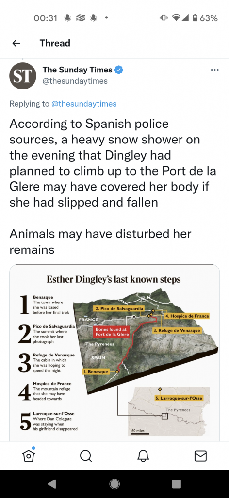 What I have looked for through some of the earlier threads and news reports is what was the weather the 23rd November 2020 in the area near the Port de Glere, the day Esther was likely to be coming up it. I've seen posts saying in general that the weather was good but nothing specific apart from this tweet from the Sunday Times 24th July. It makes me wonder if Esther was late coming up and encountered bad weather. There was likely already snow on the French side.