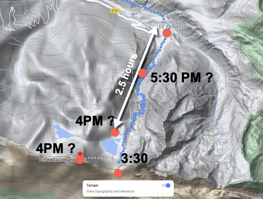 Considering the possibility that she did not climb to the Pic de Sauvegarde, and instead went to the Refuge de Venasque, arriving at 4PM, she could have continued hiking until sunset. It seems there are spots in the area where people have disappeared. The more I read about the area, the more I notice that the trails are not recommended after the end of October.