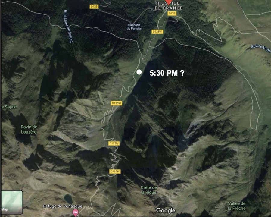 If she descended Port de Benasque immediately after sending the last text, decided to bivouac that night and walked past Refuge de Venasque, continued along either the planned route or the changed route, it would potentially put her close to that ravine at dusk. The chances of falling into that are slim I know, but it would explain why no trace was found.
