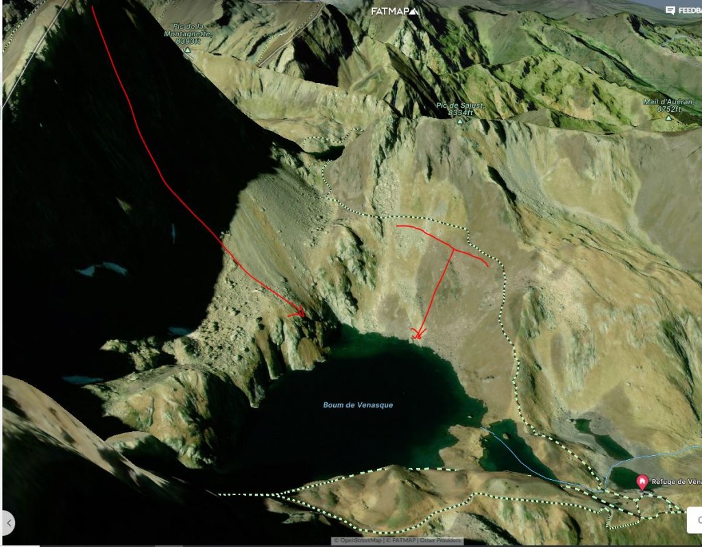 I took a snip of that FatMap 3-D image @Ruthbullock provided and boy, it is such a great resource to really see the trail systems in that area. So much so I now realize for the first time that another point of high risk for falling into Baum de Vanesque could be the trail that goes towards Port de Glere from the Refuge de Vanesque, with pic de Sujust on the way (around the corner). I have posted that snip here with red arrows depicting the two steep fall zones that are readily apparent.