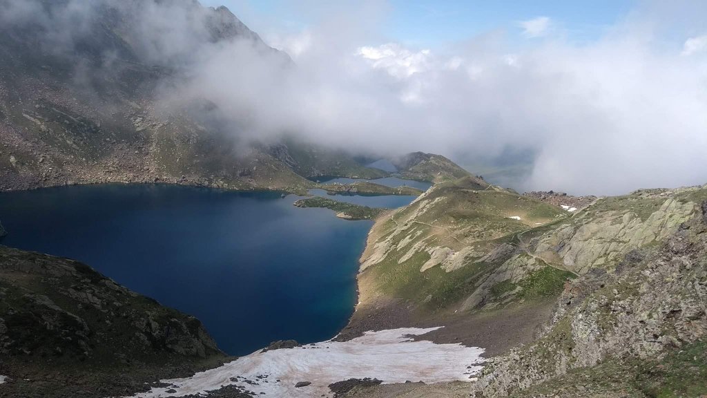 The third snowy photo does look...to my untrained eye...like there is a gentler slope around the lake. Is that area on the left where we think the trail is however? Edited to add this photo was taken on Oct 15, 2020.