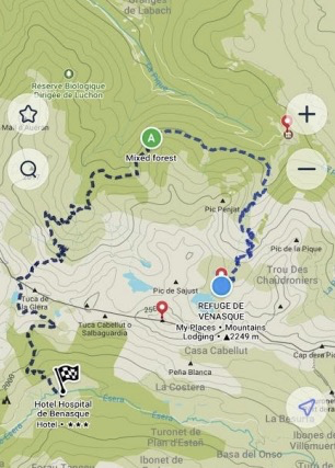 I found that comment so odd because she intended to stay at the Refuge de Venasque, which is in France, and said she might "dip into France." It's as though she hadn't looked at the maps at all, other than how to get to the Pic de Sauvegarde.