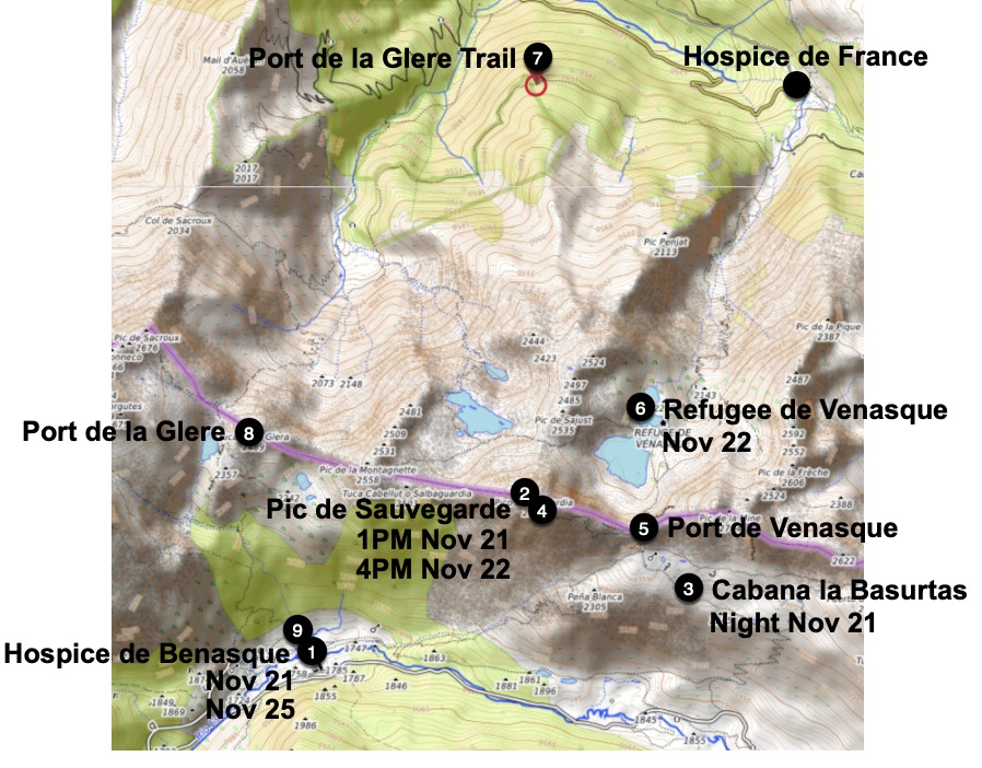 Yes, #6 - #8 is the trail that is included in the dossier. I think she would have bivouacked somewhere near the Port de la Glere overnight on Nov 23 and returned to the van on Nov 24. That would coincide with driving to France on Nov 25.