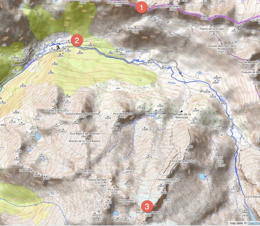 Maladeta AFAIK. You can see it from the top of the Pic, as though right in front of you. ED would have seen the tracks in the snow, maybe even a person or two, and known you could get up there. DC said she had microspikes with her: the only reason you'd need those is on snow, and there wasn't any below the Pic. So, her thought might have been to go to the glacier. Indeed, she might have tried on both the 21-22nd and 23rd.