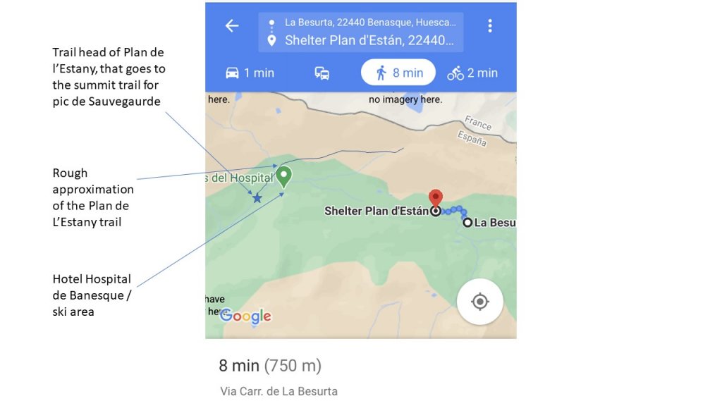 Hi CMC... using your own map from upthread, in which you show the close proximity of the two Cabanes / Refuges (Plan d'Estan and La Besurta), I added in the locations of where I believe Ballarin dropped ED off - at the trail head of Plan de l'Estany (not to be confused with the refuge of Plan d'Estan!). I hope this helps!