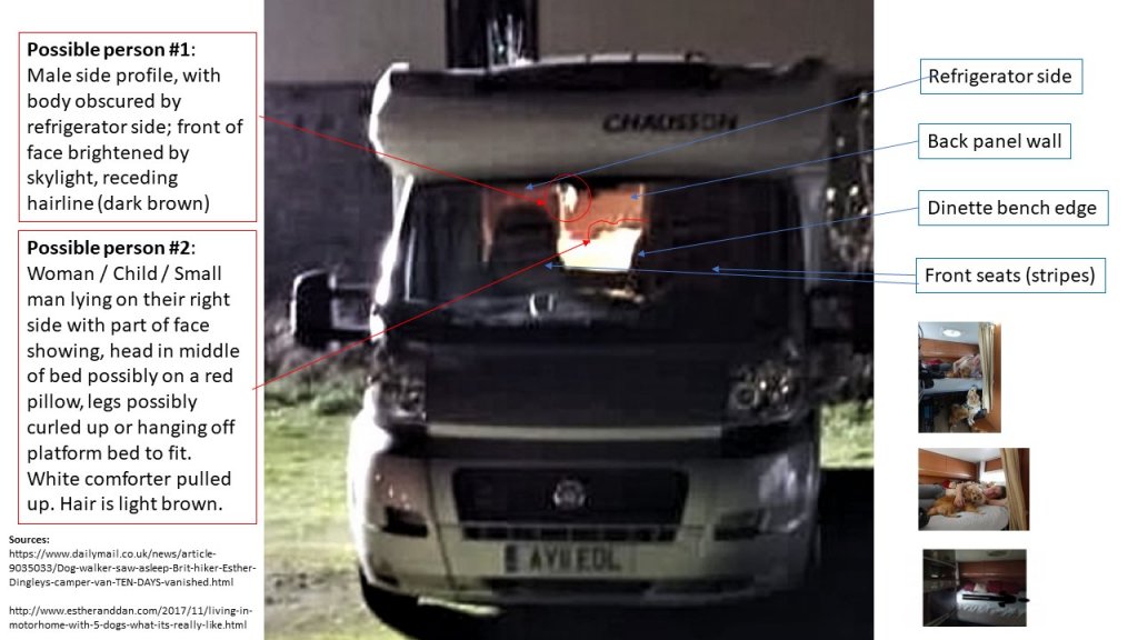 “Accepted media reports’ provided the testimony of a witness who reported someone in the van for several hours days after Esther is reported missing. She took a picture to confirm what she saw. She claims she was dismissed by the local police who then provided media with a very bizarre explanation. They did not deny that someone was in the van. They said it was a ‘forensic examiner’ laying across the bed...for several hours..having arrived in a stealthy unmarked car!