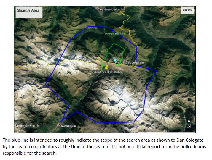 FWIW, here is the map from the LBT Global / DC dossier depicting the vast search area as reported to DC by SARs - including the Maladeta Glacier. I have also included a link to Google Maps for the same area that you can mouse around to check out. ZaZara had first provided that Google Map link back on Thread #2...