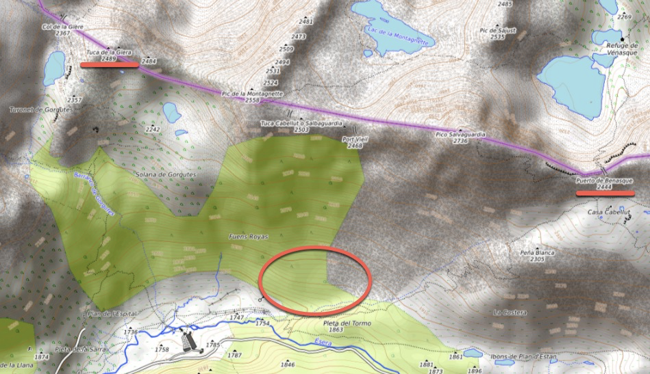 I have wondered whether she thought she could create a new trail between Pic de Sauvegarde and Port de la Glere, following animal trails (as that is mentioned in her blog) between the two points on the mountain ridges.