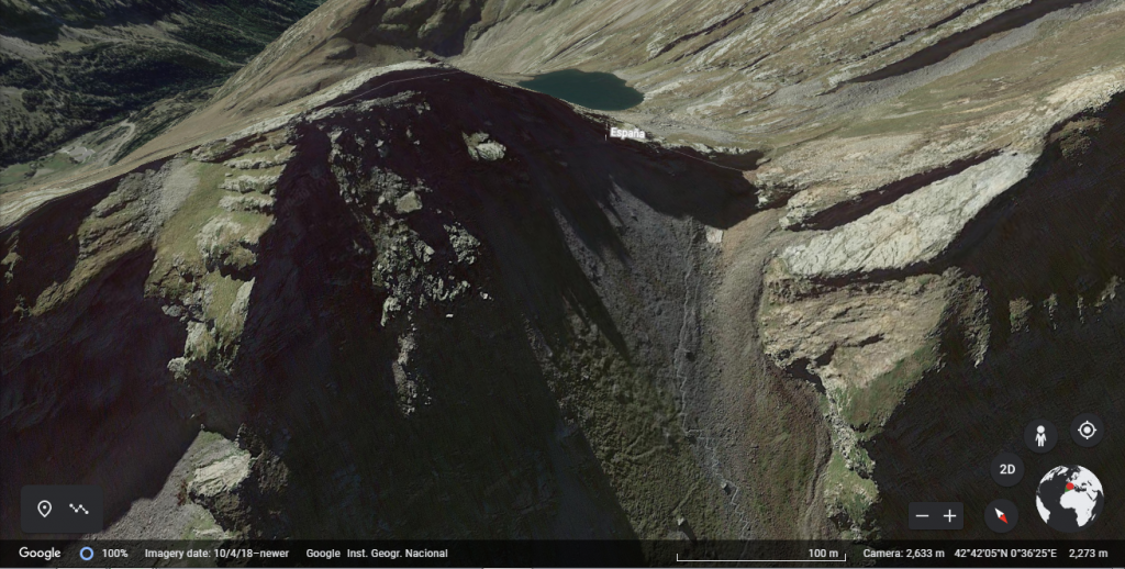 Pic de la Glère is the craggy peak in the left side of this image. Port de la Glère is just above the scree field to the right. The point of view here is southwest into Spain: